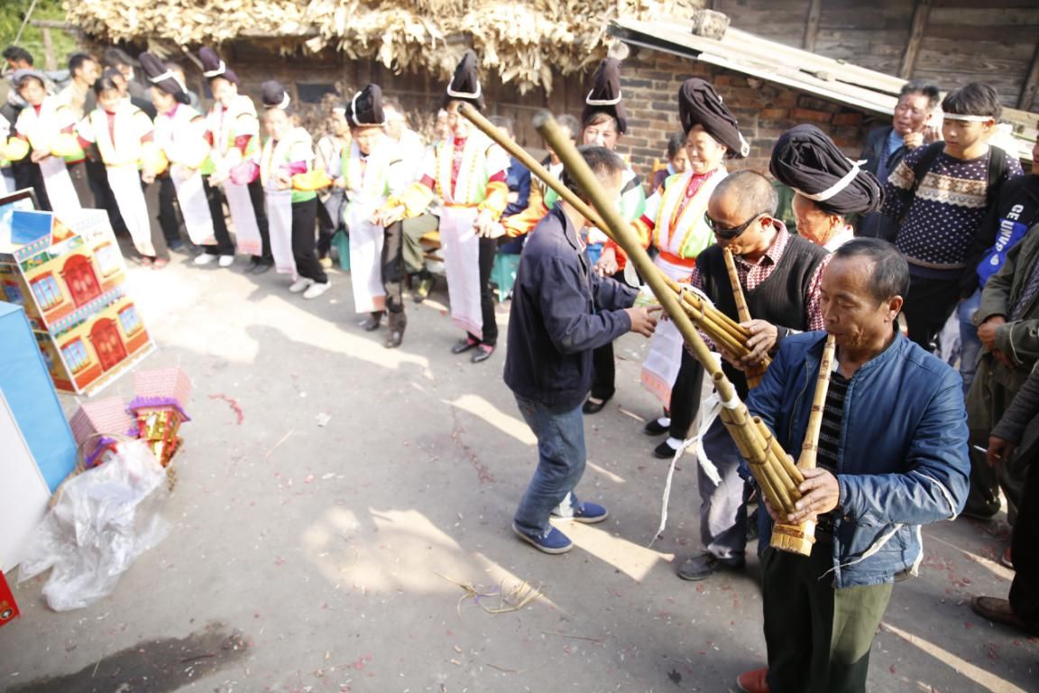 蘆笙詞曲:高坡的蘆笙詞主要以口述詞代代傳承,蘆笙詞(曲)分為“懷念曲(僅一曲)”、“喜曲”、“吊喪曲(僅一曲)”,據(jù)王永貴老師介紹原來(lái)三百六十天每天有一曲,到現(xiàn)在僅傳承七十二曲或最多一百二十曲。在吹奏和舞步方面內(nèi)容相同,但技巧方面各個(gè)村寨略有差異。在曲的排列上“懷念曲”為第一曲,吹奏第一曲時(shí)必須站著吹,每開(kāi)始吹,必須先吹第一曲,否則會(huì)被人取笑不懂規(guī)矩。從這點(diǎn)看來(lái),“懷念曲”有很強(qiáng)的民族認(rèn)同感和地域特殊性。高坡蘆笙以苗語(yǔ)腔調(diào)為主旋律,不懂苗語(yǔ)腔調(diào)的人無(wú)法自然跟隨蘆笙的曲調(diào)起舞?!暗鯁是北仨氃趩适禄顒?dòng)才能吹,它的舞姿比較特別,以跪拜亡者的姿態(tài)為主。
