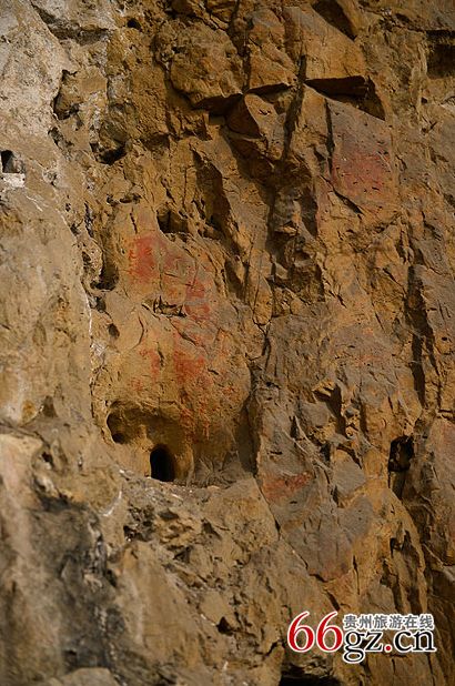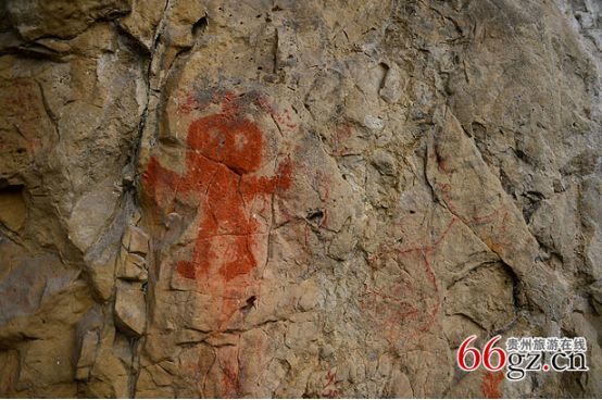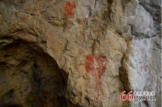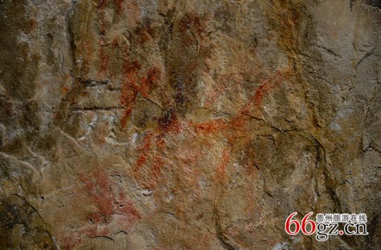 據(jù)資料載,金山洞古代崖畫(huà)以赭色涂繪人、馬、狗等等,隱約可見(jiàn)形態(tài)各異的大小圖像二三十個(gè)。人物多作行走狀,亦有雙手高舉者,似乎在祈禱。從其畫(huà)風(fēng)觀(guān)察,與相距不遠(yuǎn)的省級(jí)文物保護(hù)單位--長(zhǎng)順龍家院崖畫(huà)十分相似。
